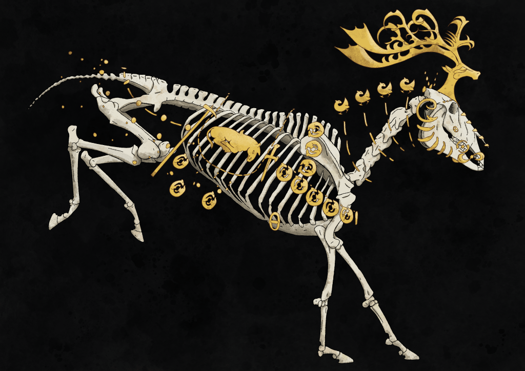 A pair of illustrations based off of Scythian funerary goods, clothes and horse tack.